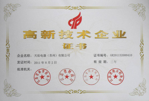 热烈祝贺天佑电器(苏州)有限公司(以下简称我司)于2011年8月17日起被认定为国家高新技术企业!现已接受科技局证书编号。